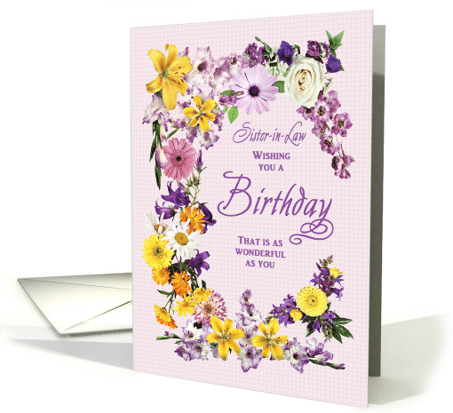 A floral birthday card wishing for a wonderful birthday for your sister-in-law. A frame of many kinds of flowers with a heartfelt message to have a wonderful birthday.