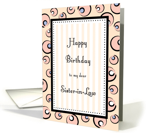 Cute and fun Birthday card for Sister-in-law features funky bubbles in pink, white and purple on a peach background. Black polka dots frame the outside sentiment which sits on a light pink and white vertical striped background. Classy and fresh with a feminine feel.
