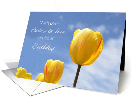 A beautiful, cheery birthday card for Sister-in-law with a blue sky, white clouds and yellow tulips. Pretty, feminine, and inspiring with a sweet message.