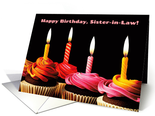 To a wonderful Sister-in-Law on her birthday! A fun card, with cupcakes and candles on a dramatic black background and a wonderful message inside.