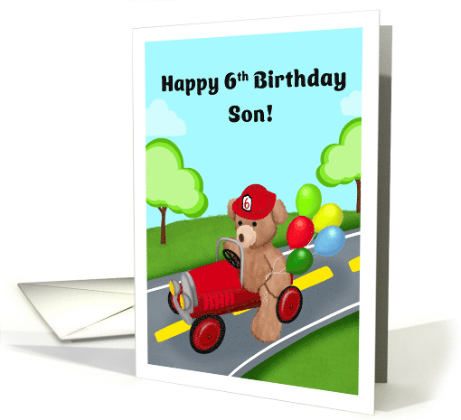 This birthday greeting card features a cheerful teddy bear riding in a shiny red firetruck with a bundle of colorful balloons drifting into the sunny sky. It is the perfect way to celebrate your son’s 6th birthday with love, joy, and playful birthday wishes just for him.