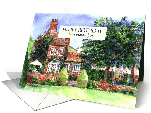 Based on watercolor painting by myself, Farida Greenfield of Manor House in Heslington, York, England. A stunning traditional British house and beautiful garden around it with colorful flowers, shrubs and green trees inside enclosure of brick wall, an idyllic peaceful place. The card is designed for Son on Birthday.