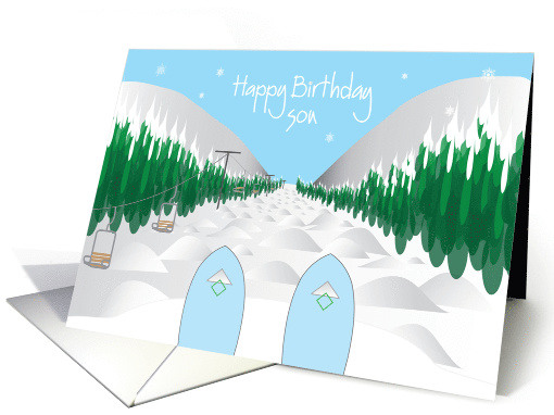| Title: | Happy Birthday for Son, Snow Skiing Ski Tips with Slope & Moguls |