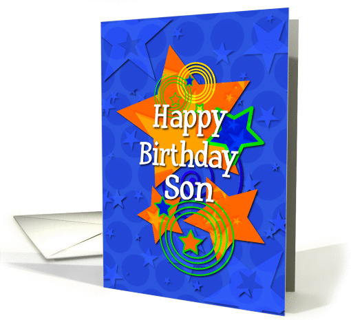 Say Happy Birthday to your Son with this colorful mix of stars and swirls. Original digital art design by Betsy Bush of Birthday Cards Cafe'.