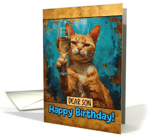 A cute ginger cat painted in vibrant colors raises a glass of bubbly in a celebrational toast to your birthday and the text "dear son Happy Birthday!" in blue on a gold colored background. A fun card to send to your wonderful son for their birthday.