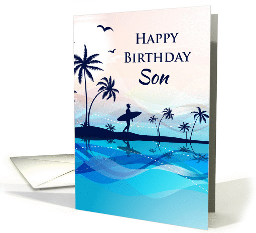 A birthday greeting for a special Son with man holding surfboard in a tropical setting with palm trees and water.