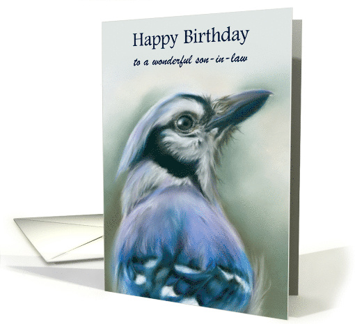 A symbol of both intelligence and determination, the blue jay on this birthday greeting is rendered in soft pastel hues on a gray-green background. Text may be customized for your son-in-law or for any relative or recipient.