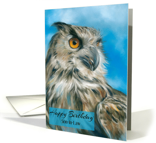 Your son-in-law will appreciate a beautiful birthday card customized especially for him. This design features wildlife art in soft pastel hues picturing a majestic eagle-owl in profile with a keen orange gaze and a radiant background of sky blue.