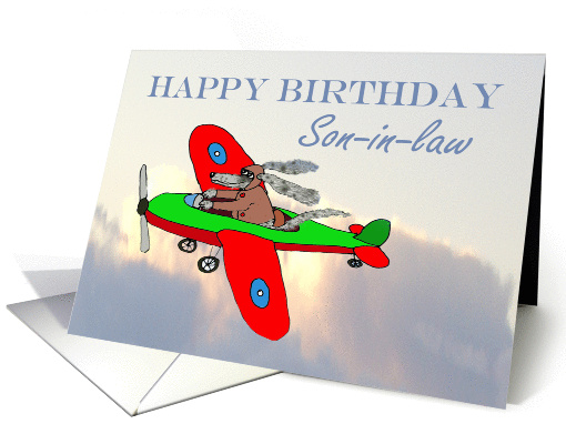 A shaggy grey dog is piloting an open green and red aeroplane.He is wearing a flying helmet and jacket.There are grey clouds."Happy birthday Son-in-law" is written a the top in white.