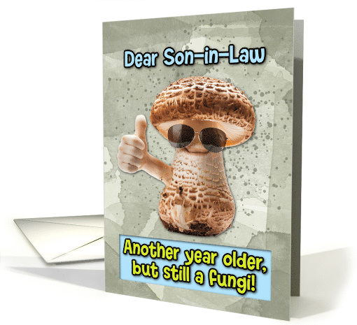 A fun mushroom with sunglasses gives the thumbs up on a olive green watercolor background with splatter effect and the text "Dear son-in-law another year older, but still a fungi!" in lime-green in a light-blue box. A fun card to send to your wonderful son in law for their birthday.