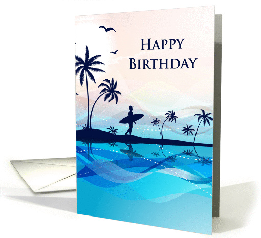| Artist Notes: | A general birthday greeting with man holding surfboard in a tropical setting with palm trees and water. |