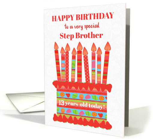You can add the age to this brightly coloured birthday card for your stepbrother, with a strawberry birthday cake. The cake has lots of candles with different patterns and there is a patterned band around the cake with colourful summer fruits - strawberries, raspberries, limes and orange slices. Above the cake, the greeting, in red lettering, is 'HAPPY BIRTHDAY to a very special Step Brother' and on the cake there is a space for you to add the age, followed by 'years old today!' in white lettering. Please feel free to customize the inside message if you wish; you can change the font and the colour as well as the message.