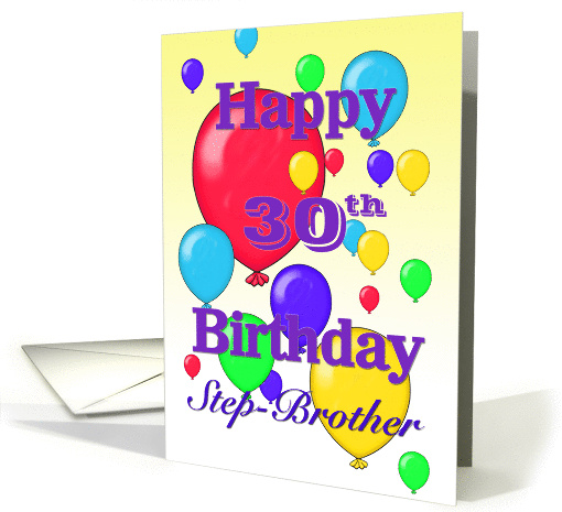 A colorful, fun 30th birthday card for Step Brother with red, blue, yellow and green balloons of all sizes in the background.