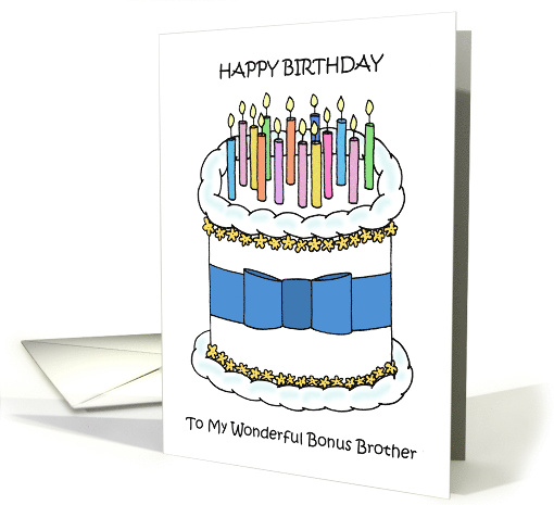 An illustration of a simple white birthday cake which is decorated with multicolored lit candles and a pink bow. The words 'Happy Birthday to my Wonderful Bonus Brother' accompany the image.