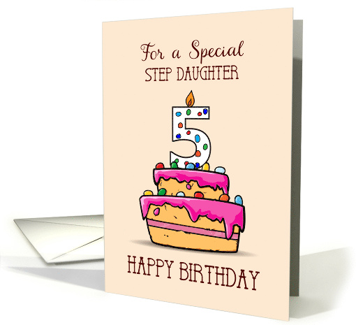 | Artist Notes: | A big number 5 candle is sitting atop a beautiful pink cake that is covered with colorful sweet candies is on the front of this card. Send this cute card now to your step daughter celebrating her 5th birthday. Make her know she is special to you. |