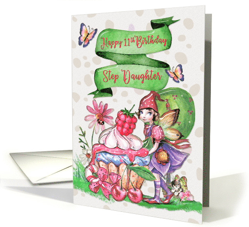 | Artist Notes: | Send Happy 11th Birthday greetings to your step daughter with this fun and girly design featuring a pretty fairy with a big cupcake topped with a raspberry. The fairy is surrounded by flowers, a kitten with butterfly wings, a ladybug, two butterflies and a whimsical tree. Ribbon is digitally created, not an actual 3D element. |