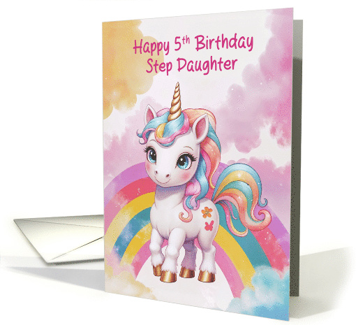 | Artist Notes: | Celebrate your stepdaughter’s 5th birthday with this enchanting unicorn card, made to honour her growing spirit and sparkle. A graceful white unicorn stands beneath a glowing pastel rainbow, set against a sky of blush and peach-toned clouds. Her flowing mane and tail shimmer in soft waves of aqua, pink, and gold, while delicate butterfly-shaped markings bring a magical, fairytale charm. Digitally illustrated in a polished, storybook style, this design captures the wonder of turning five. “Happy 5th Birthday Step Daughter” appears in joyful pink script—a heartfelt and whimsical keepsake for a very special girl. |