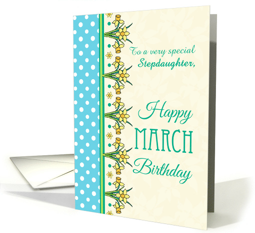 A pretty March birthday card for your step daughter, with a border of white polka dots on turquoise and golden yellow daffodils in a row. The front cover greeting is, 'To a very special Stepdaughter,' at the top and 'Happy MARCH Birthday' lower down, in turquoise green lettering on an ivory background. The inside message is just a suggestion and you can easily personalise it, changing the words, the colour and the font, if you wish; or you can delete the inside message altogether if you prefer a 'blank inside' card.