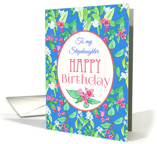 | Artist Notes: | A pretty floral Birthday Card for your stepdaughter, with a pattern of Mock Orange and Weigela on a bright blue background. The design is from a Stepdaughter,' in blue and 'Happy Birthday' in deep pink. Please feel free to personalise the inside message or delete it. |