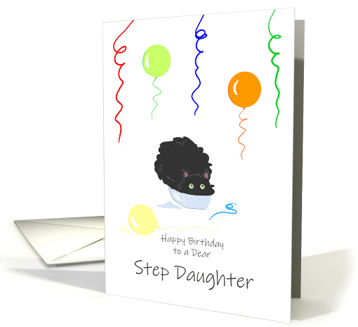 | Artist Notes: | Wish a dear step daughter a happy birthday with this funny greeting card showing a cartoon image of a fluffy black cat peeking out of a tiny box, surrounded by a colorful background of balloons and streamers. Inside verse: "It's your special day! May you find a special spot and celebrate in your own special way." |
