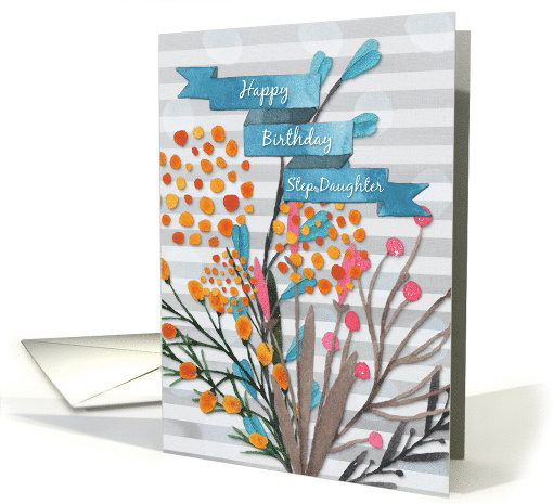 | Artist Notes: | Send Happy Birthday greetings to your step daughter with this pretty watercolor effect design with a spray of flowers on a gray and white background with stripes and a big watercolor effect ribbon. Ribbon is digitally created, not an actual 3D element |
