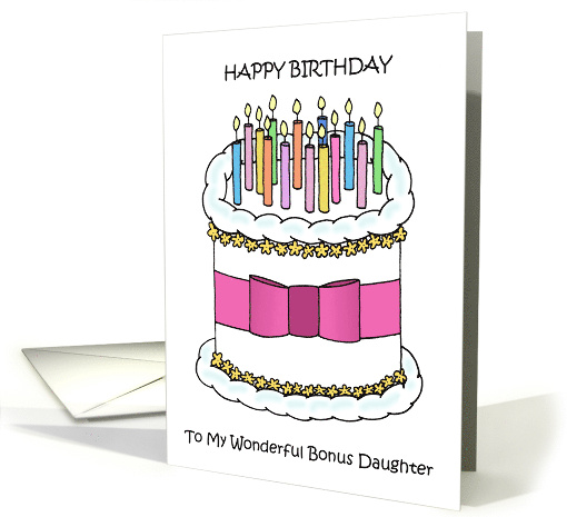 | Artist Notes: | A white, iced cake which has lit candles on top of it, small yellow iced flowers surround it and a pink bow is tied around it. The text on the front of the card reads 'Happy Birthday to My Wonderful Bonus Daughter'. |