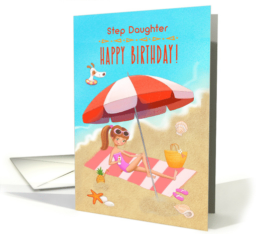 | Artist Notes: | Send fun and bright Happy Birthday greetings to your step daughter with this design featuring a girl under an umbrella on the beach surrounded by shells, starfish, and even a little dog tubing in the water. The inside sentiment is a play on words, "Sending wishes for your birthday to be beachy-keen! |