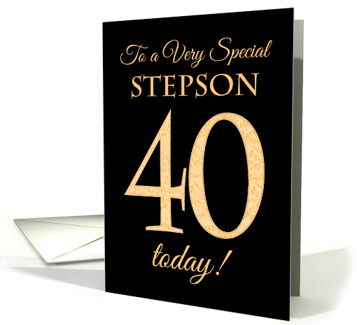 | Artist Notes: | A chic 40th Birthday Card for a 'Very Special Stepson', with a number 40 composed of gold-effect numbers and the word 'Stepson', in gold-effect, on a black background. The inside message, which you can change if you wish, is 'Happy Birthday' |