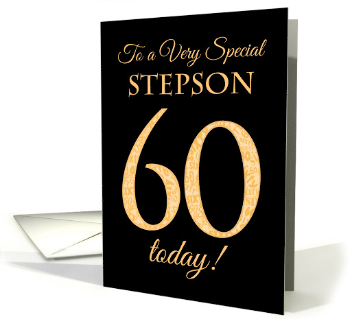 | Artist Notes: | A chic 60th Birthday Card for a 'Very Special Stepson', with a number 60 composed of gold-effect numbers and the word 'Stepson', in gold-effect, on a black background. The inside message, which you can change if you wish, is 'Happy Birthday' and other ages can be made on request. |