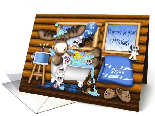 | Artist Notes: | It moose be your 3rd Birthday! An adorable moose holding his rubber duck and celebrating his Birthday in a tub full of bubbles. The bear and bunny are peering through the window holding a Happy Birthday balloon. There are mice poring bubble bath into the tub. A sweet little dachshund sits on the floor with bubbles falling on his head. A Birthday cake with candles sits on the table with a cute little mouse peering from behind the cake. The background is log siding. Inside message reads: "A big Happy Birthday to you. May your day be as special as you." Inside message may be changed by you. |