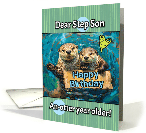 | Artist Notes: | A cute otter duo floating on their backs in the water are holding up a sign that spells HAPPY BIRTHDAY on a teal background with a stripe pattern and the text "dear step son an-otter year older!" A fun pun card to send to your wonderful step son for their special day. |