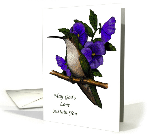 | Artist Notes: | This is my illustration of a hummingbird surrounded by purple pansies. The image is placed on a white background, making it stand out in an eye-catching way. Words say "May God's Love Sustain You". |