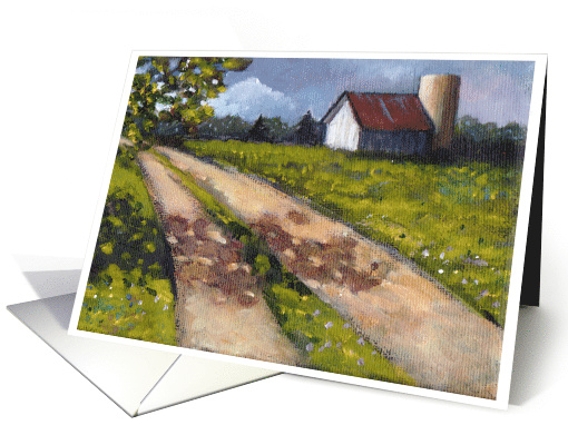 | Artist Notes: | This card features my painting of a rustic country scene, showing a road leading away from viewer, past a field and a barn. Shadows fall across the road. Inside there is a verse empathizing with the recipient's broken dreams as a marriage is ending. The verse has religious content. |