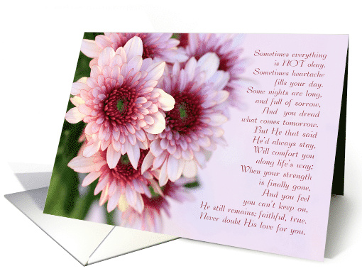 | Artist Notes: | A bright, pretty photograph of pink & white daisies with a poem about how sometimes, things are NOT okay, and we have heartache, but reminding us that Jesus will not leave us and His love for us will not fail. An encouraging and sympathetic card for a friend who is sad, and going through a divorce. |