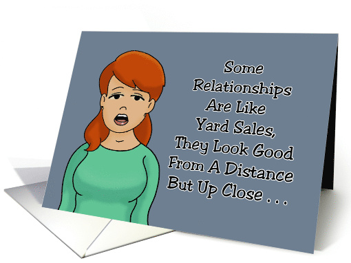 | Artist Notes: | Humorous Sympathy Card for a divorce/break up with a cartoon woman on a dark background. The words say: Some relationships are like yard sales, they look good from a distance but up close . . . Inside says: It's just a bunch of shit you don't need! Sorry about the break up. |