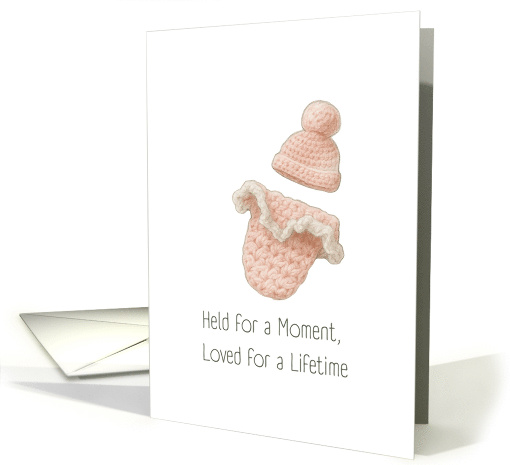 Featuring a beautifully illustrated crocheted preemie pod and hat in soft blush pink, this card honors the sacred and fleeting moments shared with a little one gone too soon. The sentiment “Held for a Moment, Loved for a Lifetime” speaks to the depth of love that miscarriage or infant loss leaves behind. A comforting card for parents facing unimaginable grief, it is a gentle expression of sympathy and remembrance.