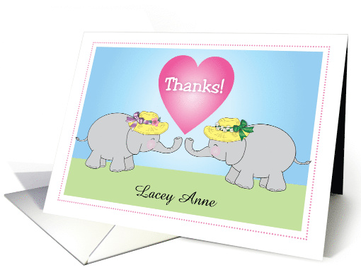 | Artist Notes: | To say thank you to someone give this custom name card with my two happy elephants wearing festive straw hats. The headline is white on a pink heart. There's a white border surrounding the card. There's also a tiny pink dot border. The personal name is placed at the bottom of the card. The inside message may be changed to fit your needs. ©Gail Pepin |