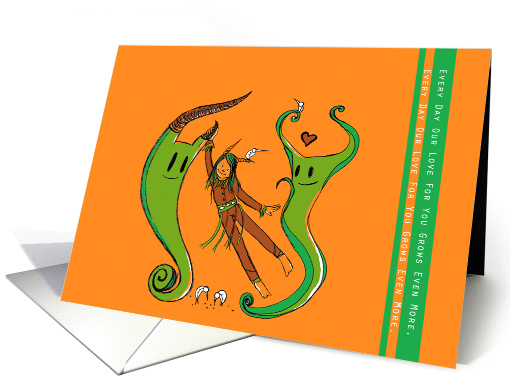 A whimsically drawn card shows an adorable wild child with her loving adopted parents. The perfect card to give to your older adopted child letting her know how grateful you are she joined your family, and how much you love her.