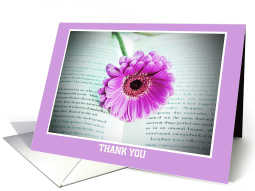 Thank you card with a pink gerbera laying on a book. Appreciation greeting card with flower.