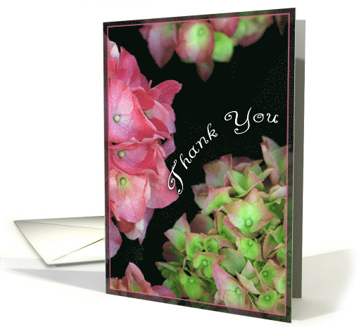 This card features an image I took that framed three hydrangea blooms at the corner and dark background so the blooms stand out.