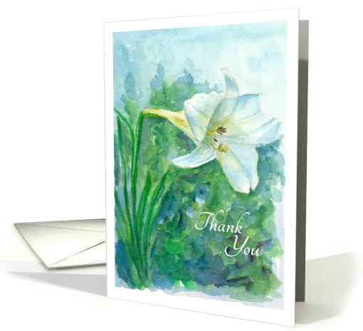 An elegant floral thank you card decorated with a white lily flower painted in watercolor with several shades of blue and emerald green.