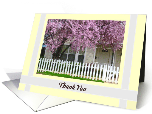 A Thank You card featuring a photo of a blossoming tree and a picket fence. You may enter your inside sentiment before checkout. You may also upload a photo to the inside at no additional cost.