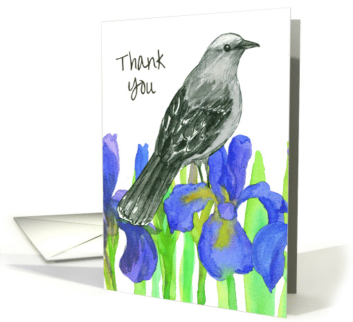 A thank you card decorated with a mockingbird drawn with pen and ink and watercolor with bright royal blue iris watercolor flowers with charcoal grey text.