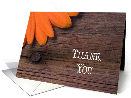 Customize the inside of the rustic Orange Daisy and Barn Wood Thank You Note Card with your personal message of gratitude and appreciation. This charming custom thank you note features a quaint floral photograph of an orange daisy flower blossom with brown weathered barn wood.