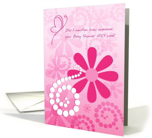 | Artist Notes: | Say thanks for the baby shower gift with this cute and girly thank you card with a pretty in pink retro flower design with daisies and strings of beads. A sweet little butterfly is in the upper left corner. Front reads: Did I mention how awesome your baby shower gift was? By: PhotographyTKDesigns. |