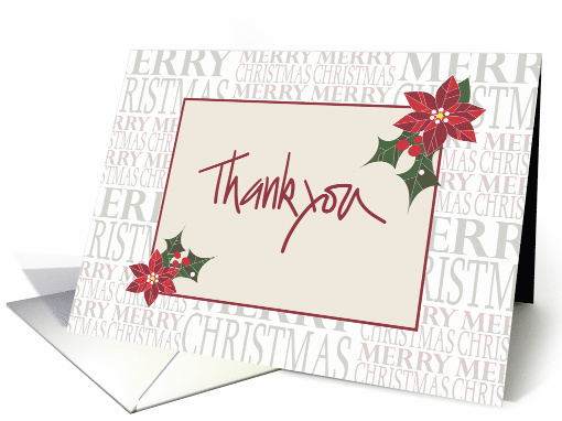 "Thank you" is the dark red uniquely artistic hand lettered wording at the center of this Christmas gift thank you card. The card has a beige rectangle, at its center, with this wording inside. All around, in the background, are repeating variations of the typography of "Merry Christmas" in different sizes, shapes and tones of red and green. Two red poinsettias pin the top right and bottom left corners of the inner rectangle, embellished with green holly leaves and round red holly berries. The inside wording of the card says "Thank you so much for your Christmas gift!"