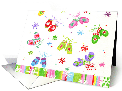 | Artist Notes: | Many little pairs of brightly decorated winter mittens in every color of the rainbow are surrounded by colorful falling snowflakes as a varied stripe border finishes off the bottom all on a pure white background. What a warm and fun way to say "Thank You," during the Christmas holiday season! Inside Verse:Thank you for the Christmas gift. It's exactly what I wanted! Original watercolor artwork and design by Audrey Ascenzo. ❤️ |