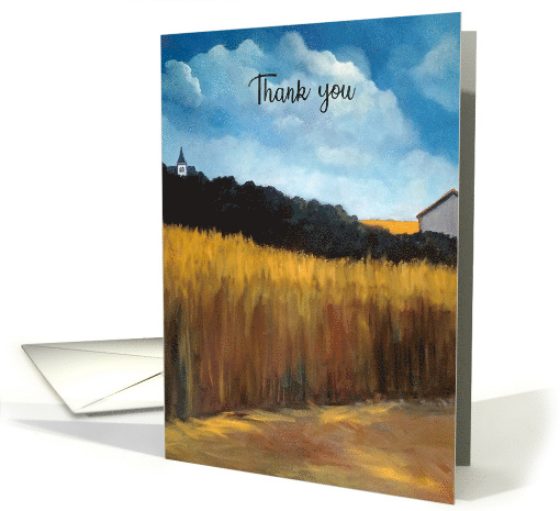 | Artist Notes: | The front of this card features a painting of a ripening wheat field against a backdrop of dark green trees. A church steeple and an old barn are seen in the middle ground, topped by a bright summer sky. Words say, "Thank you". Inside, there is a little verse, but, as always, words inside the card may be edited if desired. |