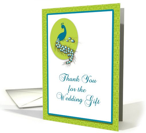 | Artist Notes: | A stylish thank you for the wedding gift card with peacock theme in teal blue, white and bright green with green floral border |