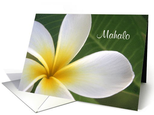 | Artist Notes: | Express your gratitude island-style with this beautiful Hawaii-themed Thank You card featuring the word Mahalo alongside a white and yellow plumeria resting on a lush banana leaf. A perfect way to send tropical appreciation! |